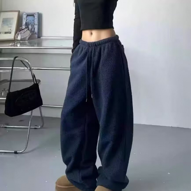 高腰のひものまっすぐな筒の束の足の衛のズボンの女性の2024冬の新型のゆったりしている輪の羊の小羊の毛の厚いカジュアルなズボン