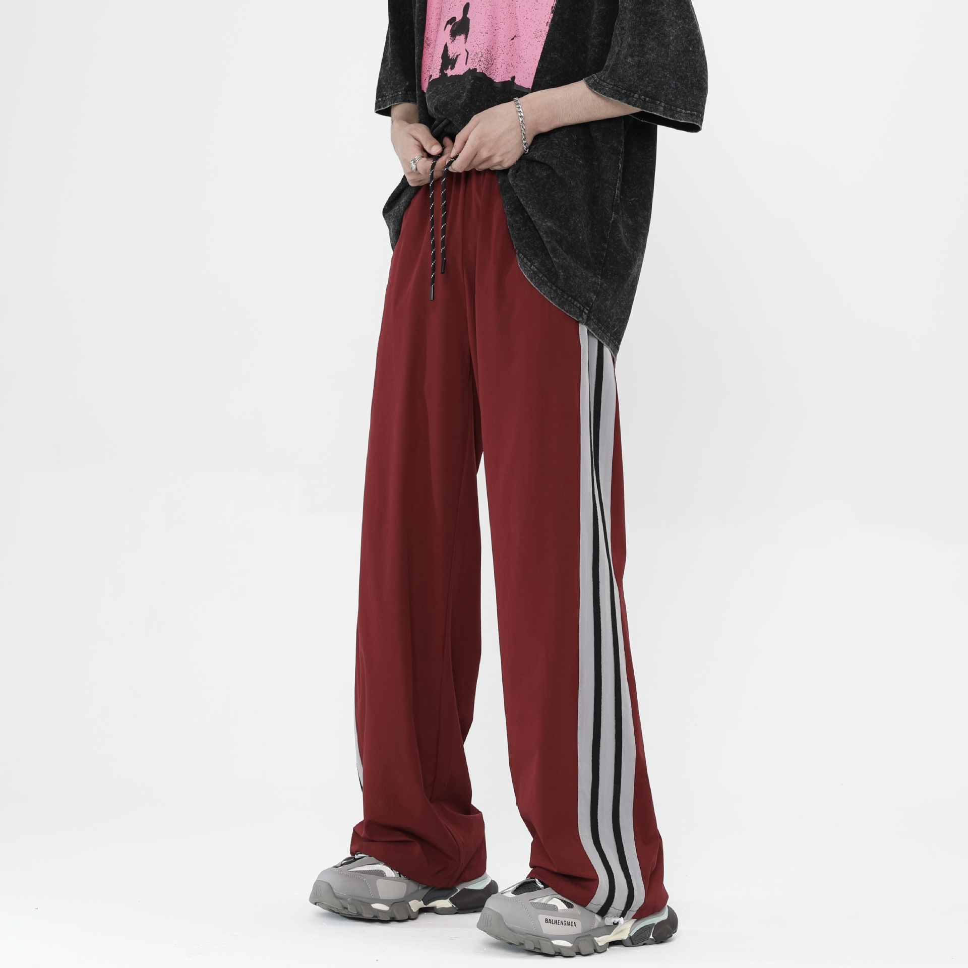 2023秋の衝突色はストライプのスポーツのズボンの男性insの潮のブランドのワインの赤色のストレートの筒の速乾のレジャーのズボンをつなぎ合わせます。