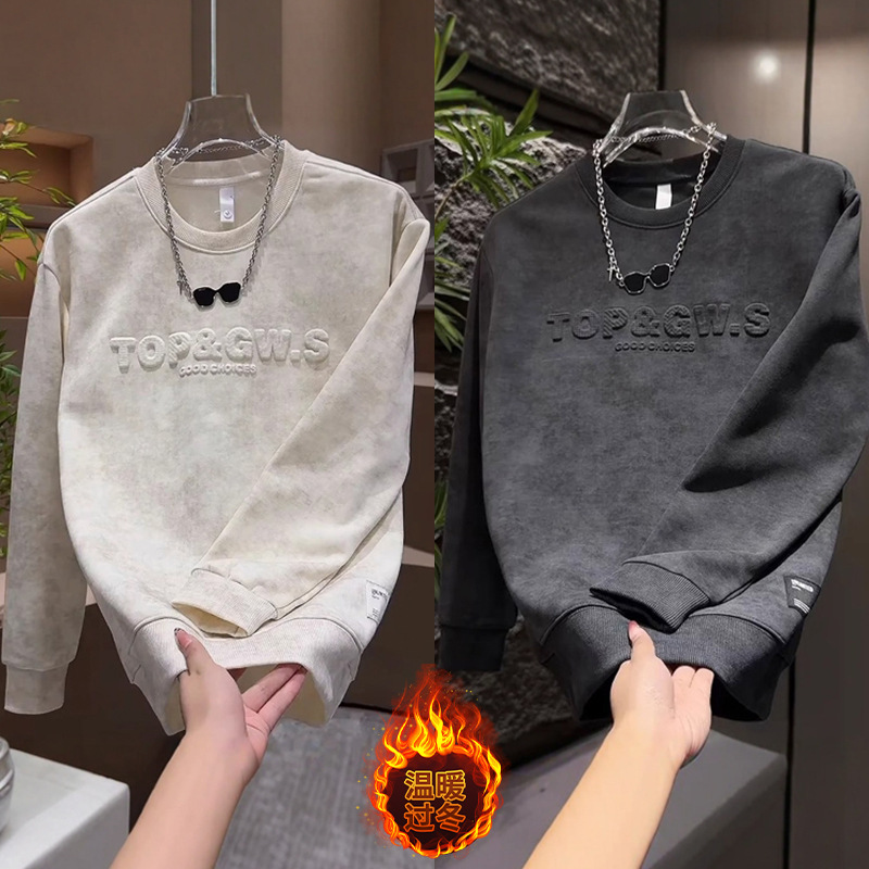 2024秋冬にベルベットをつけてトレンドを厚くして、鋼印の文字を印刷して長袖tシャツの男性のカジュアルなファッションのガーディアンを染めた