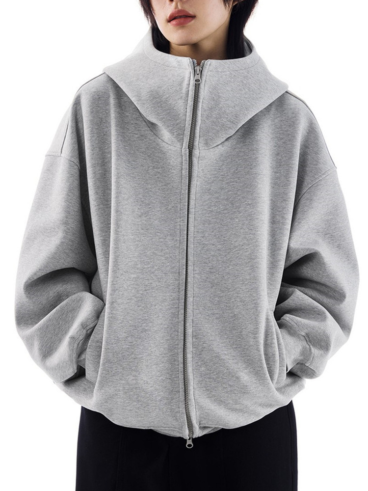 アメリカのレトロなシルエットの空気層の灰色の帽子付きのパーカーの上着の男女秋冬の新型のゆったりした重いポンドのカーディガンのファッション