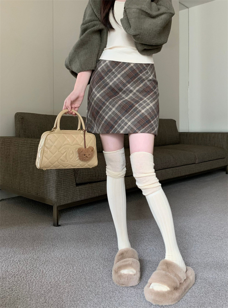 格子の毛の半身のスカートの女性の秋冬の復古の格好のスカートの高腰はやせているa字のスカートのラシャの包みの尻のショートスカートを現します。