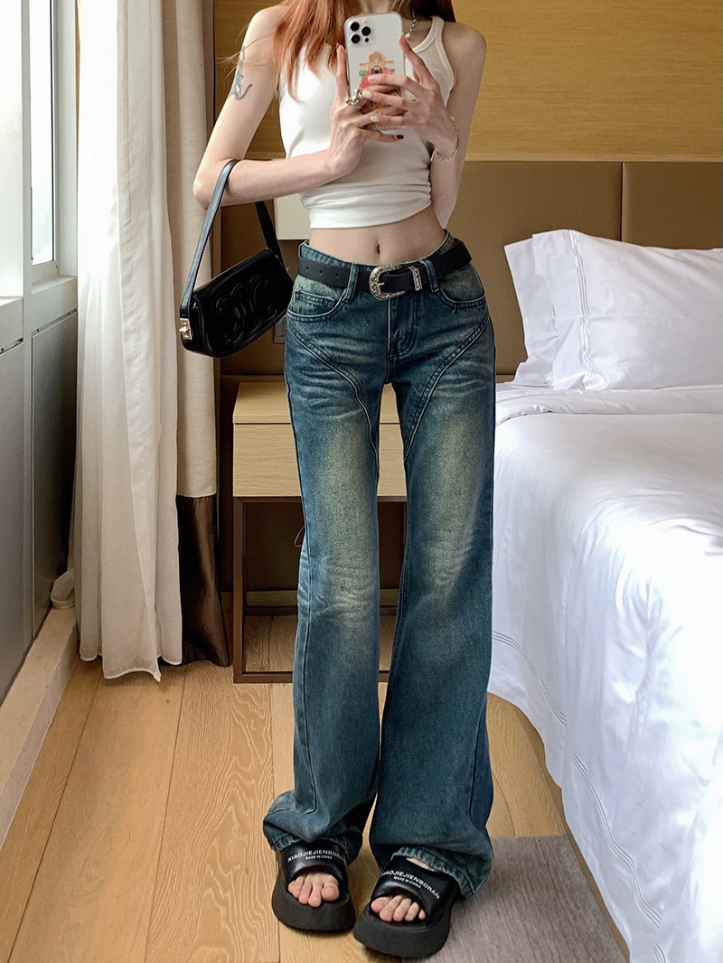 アメリカのレトロな高街のジーパンの女性の春のギャルの小さい大衆の小さいラッパのズボンの垂れ下がっている感じが現れて痩せています。