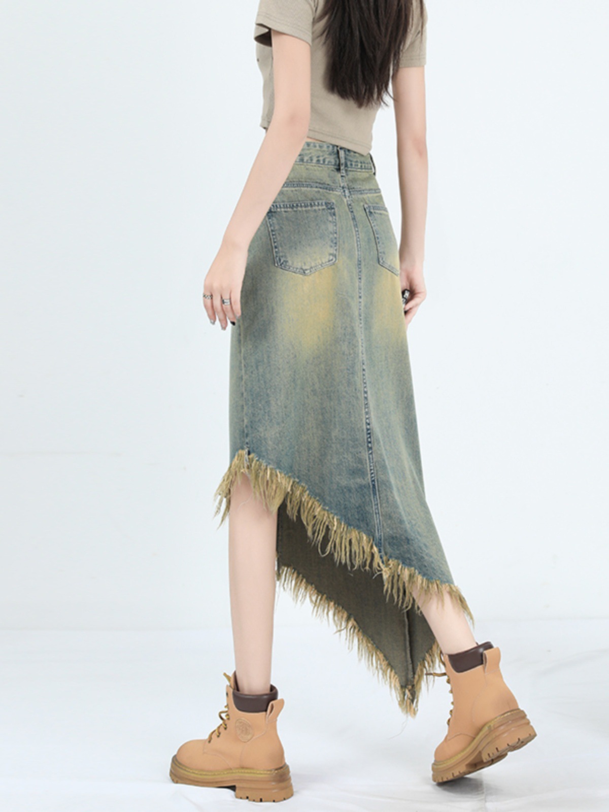 レトロハイウエストa字デニムスカートスカート女性春秋不規則デザイン感ロングスカート小柄フリンジスカート