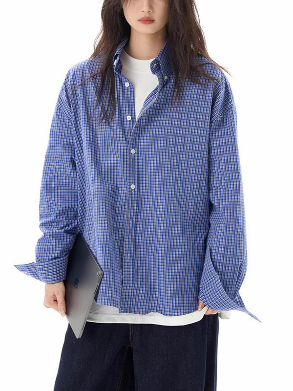 アメリカのレトロな青い格子シャツ長袖の男女の高級感があります。
