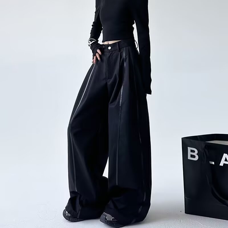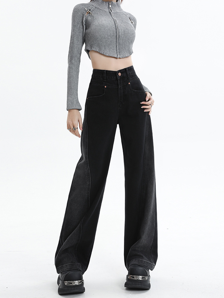色合わせの高い腰の広い足のジーパンの女性の2024春秋の新型の黒色のアメリカの復古の夏の薄い金のストレートなズボン