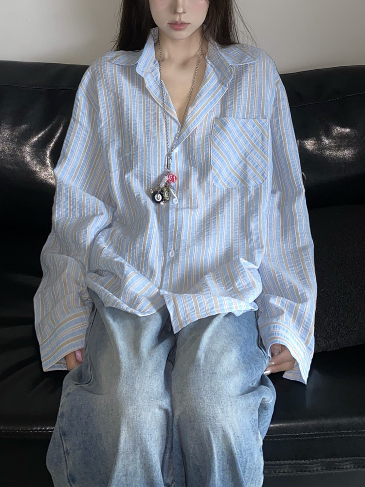 アメリカのレトロな秋の新型の怠惰な風の爽やかなストライプのシャツのコートの女性のゆったりしている百合の日焼け止めの長袖のシャツ