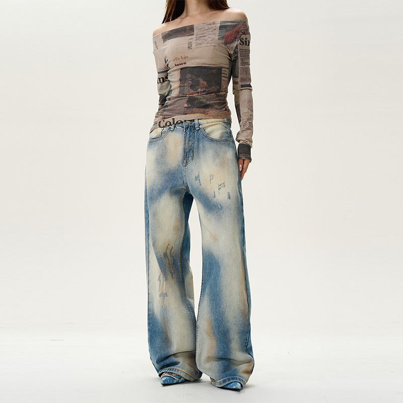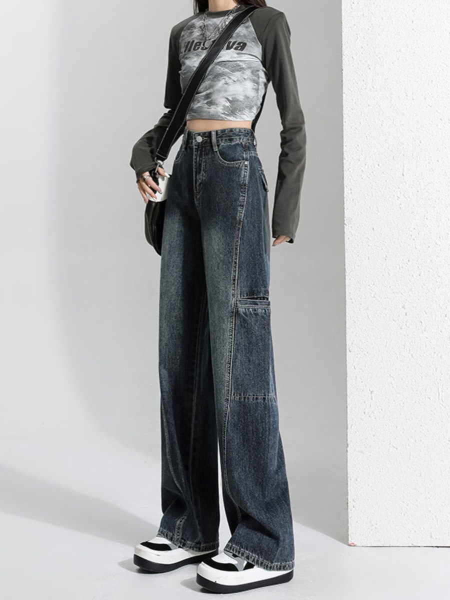 アメリカの広脚工装ジーンズの女性のゆるいデザイン感の小衆2024の新しい秋に痩せた高街のモップパンツが見える