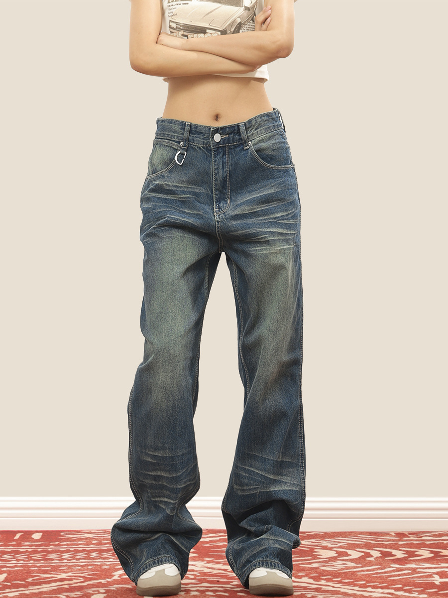 レトロなギャルの猫は低い腰のジーパンの女性のアメリカの街頭の小さい大衆が水洗いして古い感じのまっすぐな筒をして地面のズボンを引きずる必要があります。
