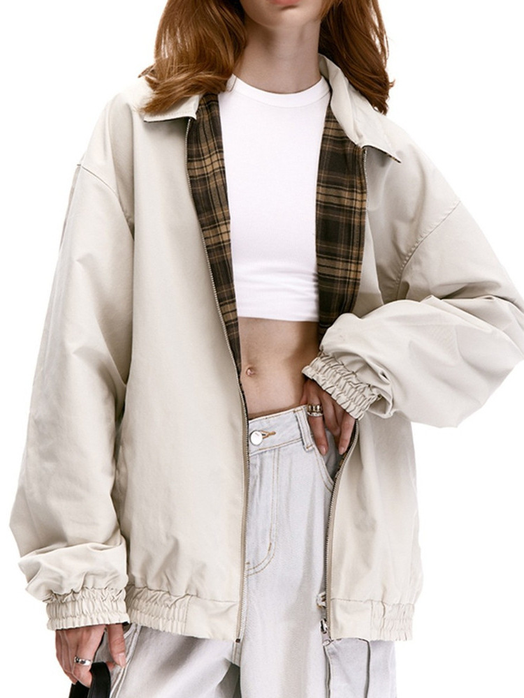 2024高級感アメリカのレトロな格子の両面にカップルのゆったりした女性と秋の新しいジャケットを着ます。
