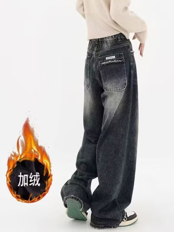 アメリカのレトロな高街にベルベットの紺色の広脚ジーンズの女性2024ゆったりとしたズボンのストレートパンツのズボンが湿っている