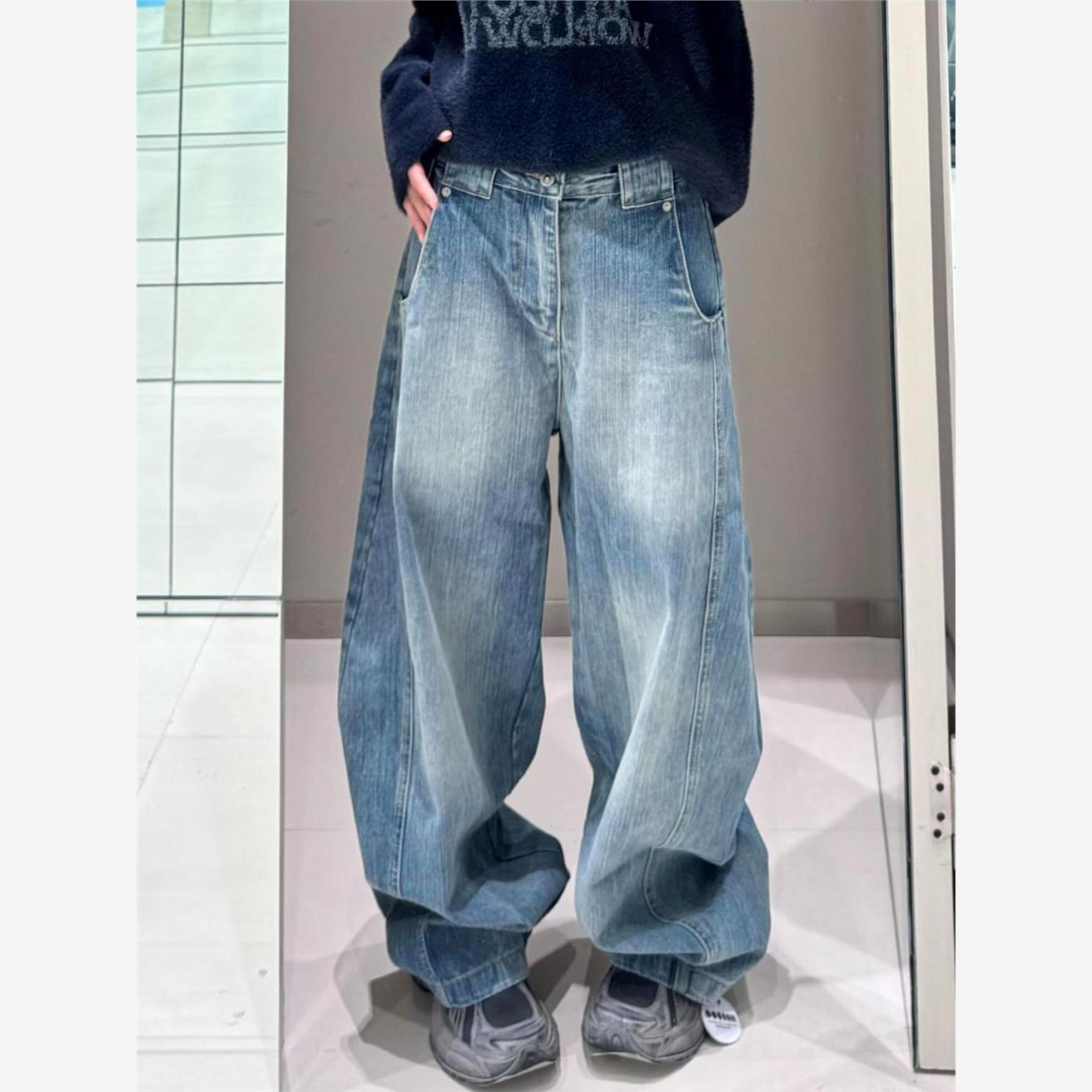 秋冬の新型の曲がった刀のジーパンの女性のアメリカ式のファッションのブランドの復古の水洗いは古いゆったりとした感じのまっすぐな筒の広い足のズボンをします。