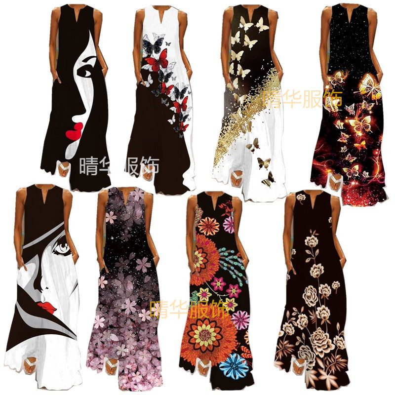 新型婦人服2022アマゾン欧米越境夏ワンピースプリントvネック袖なしワンピース
