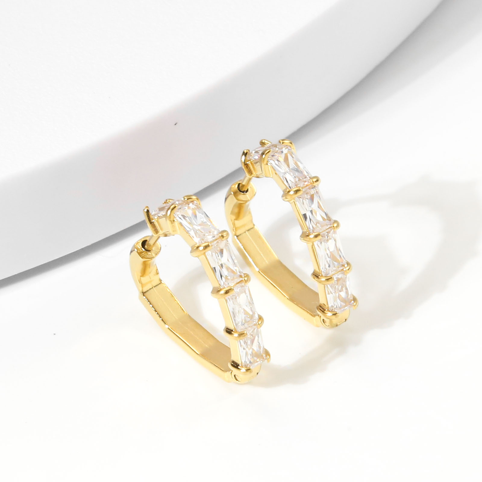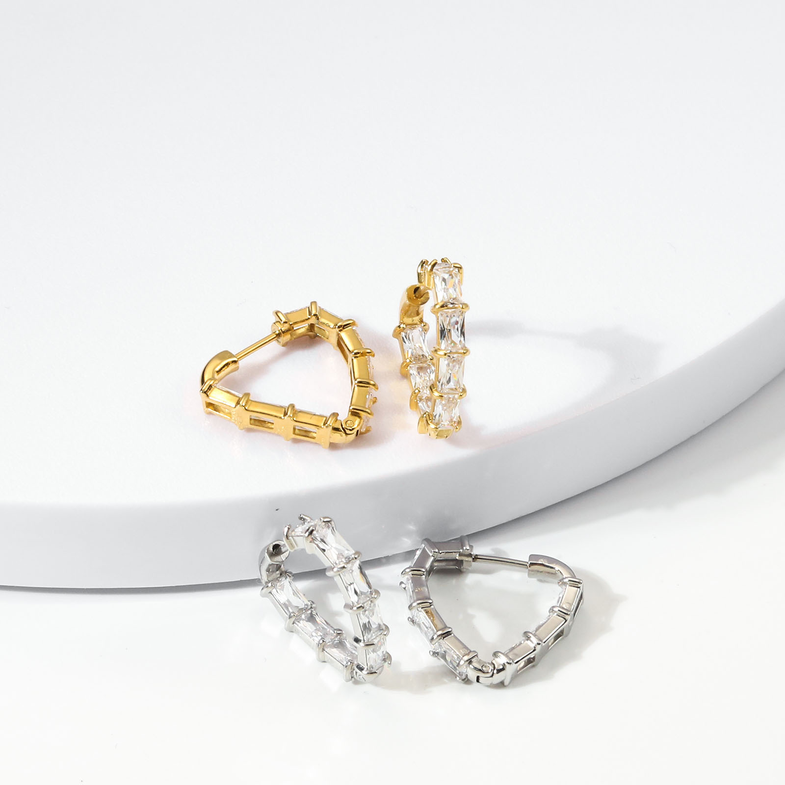 SDA欧米高級感桃ハート型耳輪に方形ジルコン異形18k金ステンレスイヤリングをはめ込んだ女性
