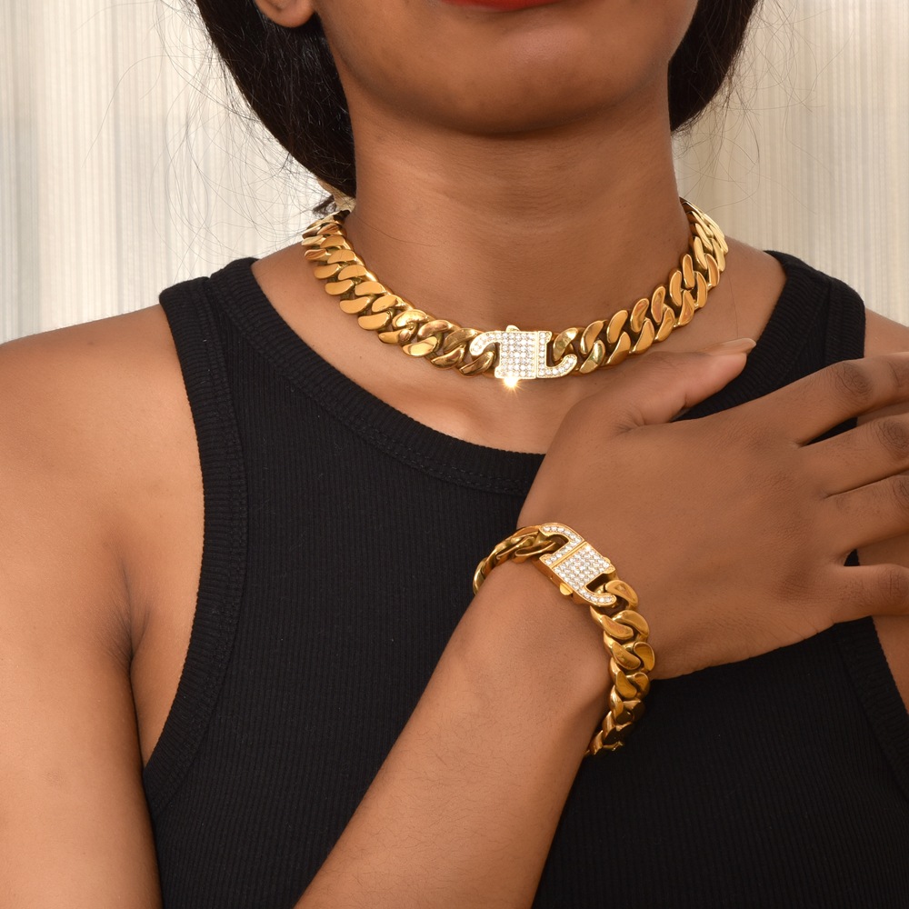 2023新型の個性的な流行のアクセサリーはドリルを持ってキューバのチェーンの男女の鎖骨のチェーンのステンレスのカップルのネックレスを鋳造します。