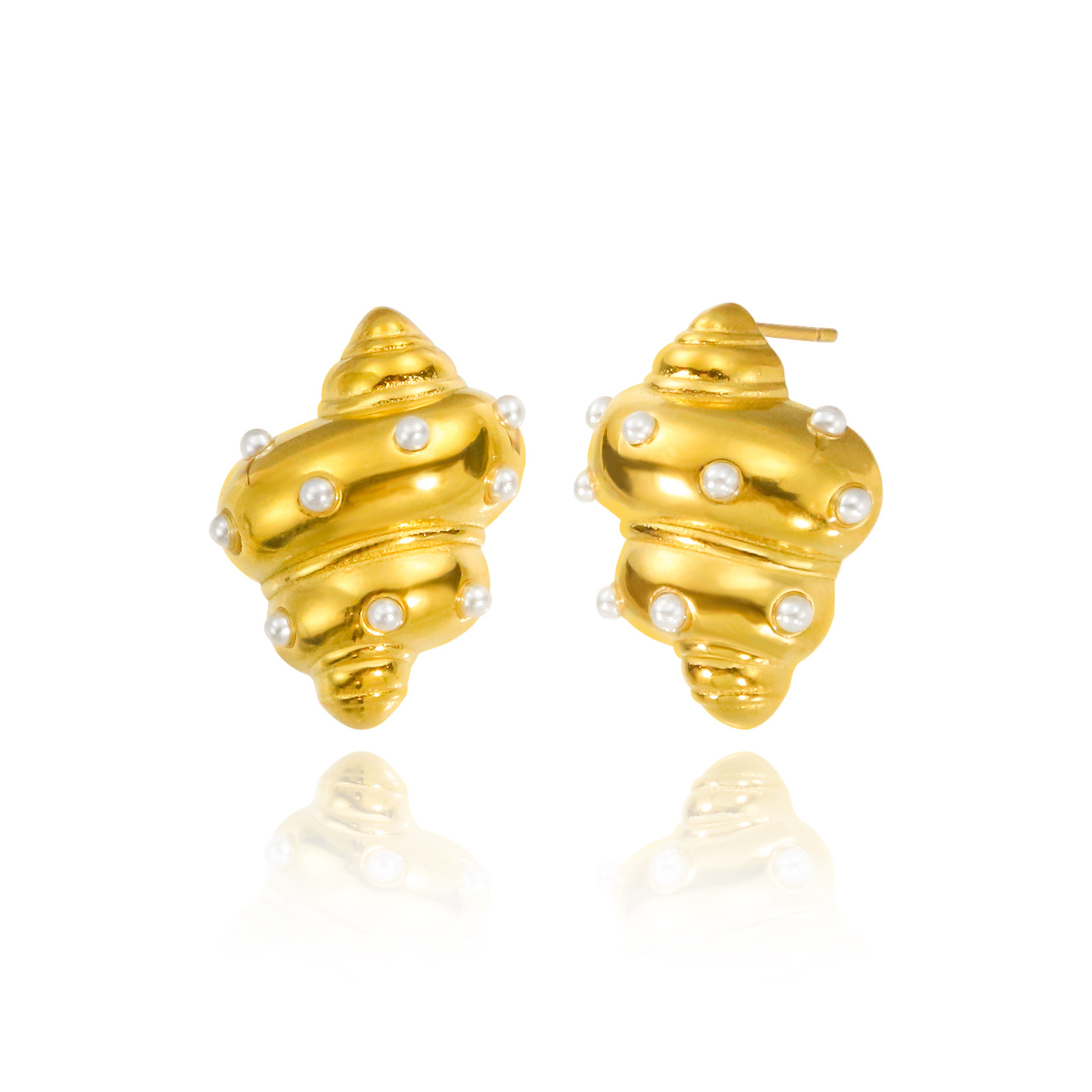 チタンスチール海スレッドピアスメッキ18kゴールドパール付きシワシェルピアスデザイン感レディース耳饰り