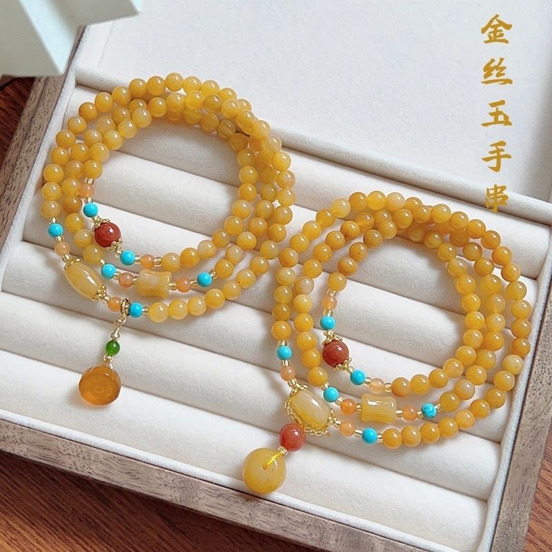 天然金糸玉三輪手串正品女性レトロ中国風ファッション蓮蓬平安ボタン蜜ろう百合ブレスレット