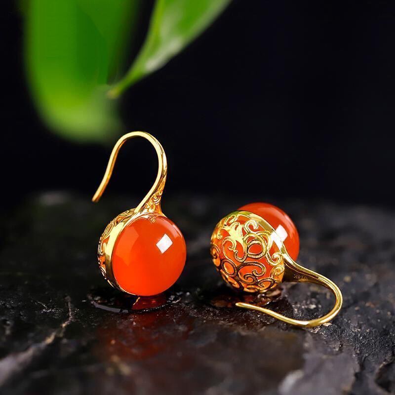 天然宝山南赤イヤリングアイスレッド瑪瑙 925 スターリングシルバーゴールドアイス透明蛍光新年赤イヤリング