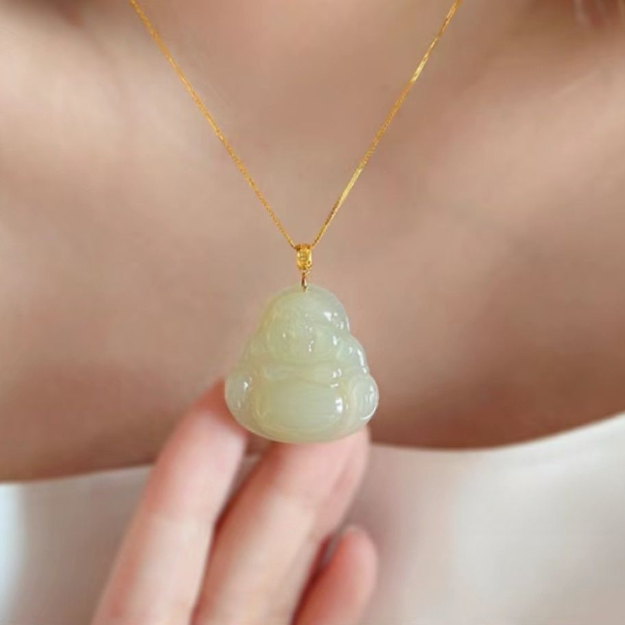 天然青白翡翠弥勒ペンダントネックレス晴水湖水緑翡翠仏ペンダント女性翡翠ペンダント笑い仏