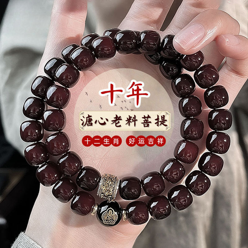半熟古材菩提樹ブレスレット十二支守護文仏珠二重丸菩提樹プレートブレスレット
