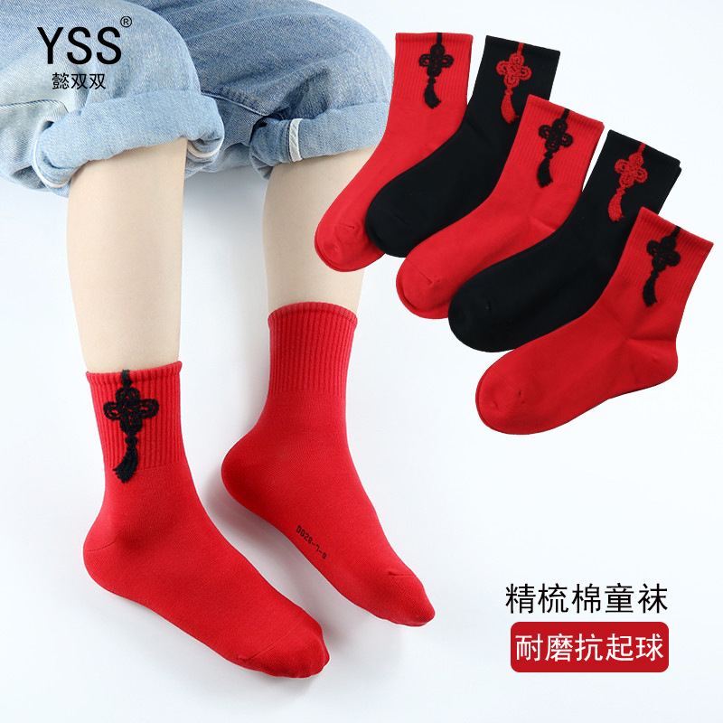 懿の両方の子供の靴下秋冬の新型の厚い漫画の中国の結び目の中の筒の靴下の精練綿の大きい赤い新年の靴下