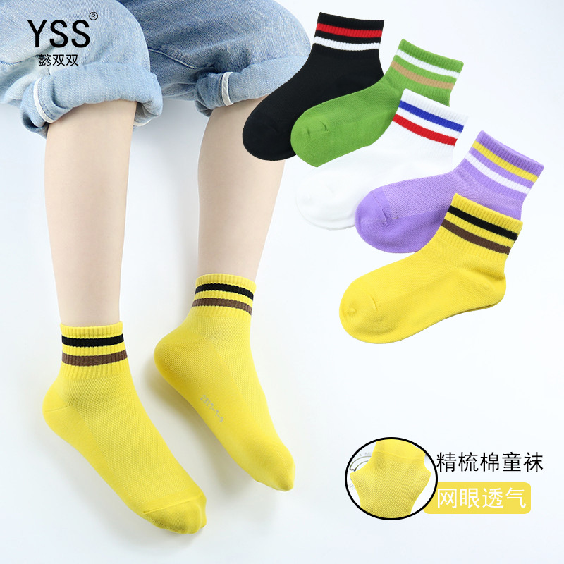 懿の両方の子供の靴下の夏の新型のネットの薄いタイプの韓国版のストライプのショートソックスの精練綿の明るい色の子供の靴下は骨がありません。