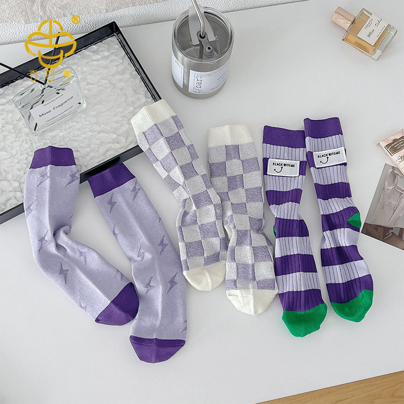 吉四象の靴下の女性秋冬の新型の韓国版の格子の中で筒の靴下の精櫛の綿の手の布の標識の双針の女性の靴下の紫色