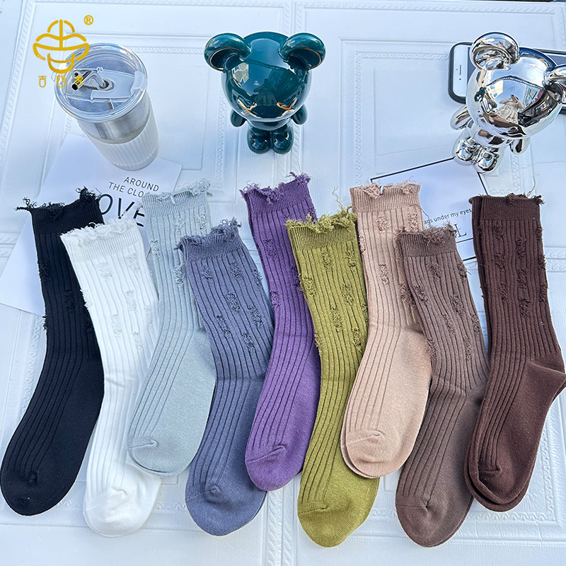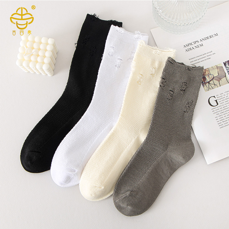 吉四象靴下女性韓国版純色破洞靴下ネット赤乞食靴下洞靴下精練綿日系スタッキングソックス