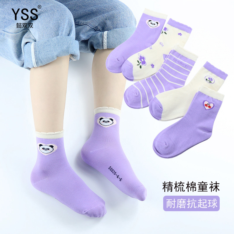懿の子供用靴下秋冬の新型の厚い漫画のパンダの中筒の靴下の精練綿の紫色の女の子の学生の靴下