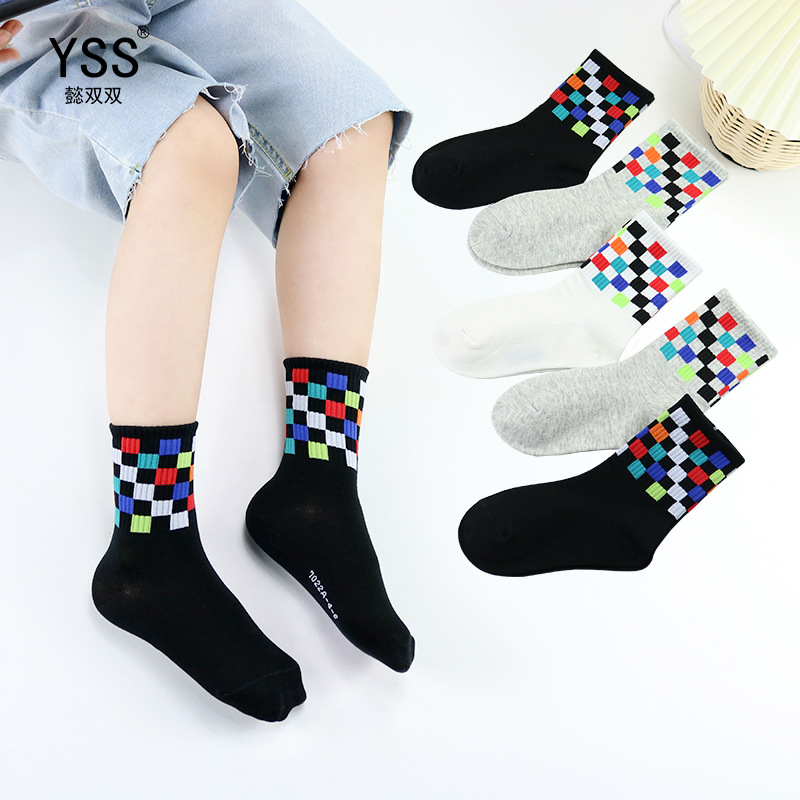 児童靴下懿は秋冬の新型韓国版カラー格子中筒靴下精櫛綿虹白黒スポーツ靴下