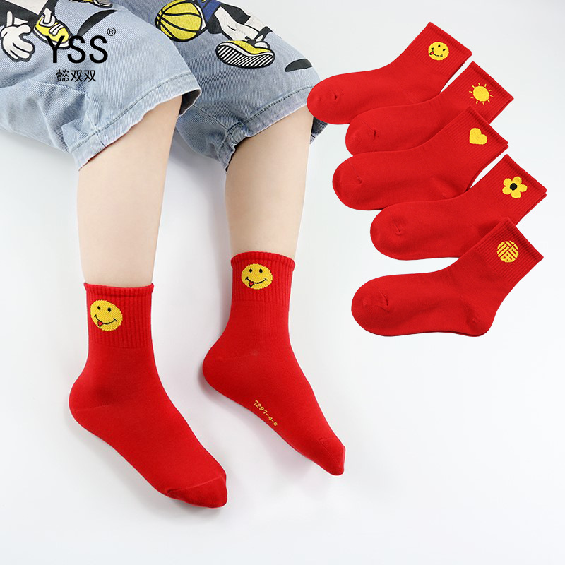 子供の靴下懿の両方の秋冬の新型の本命年の大きい赤い漫画の笑顔の中の筒の靴下の精練する綿の赤ちゃんの靴下