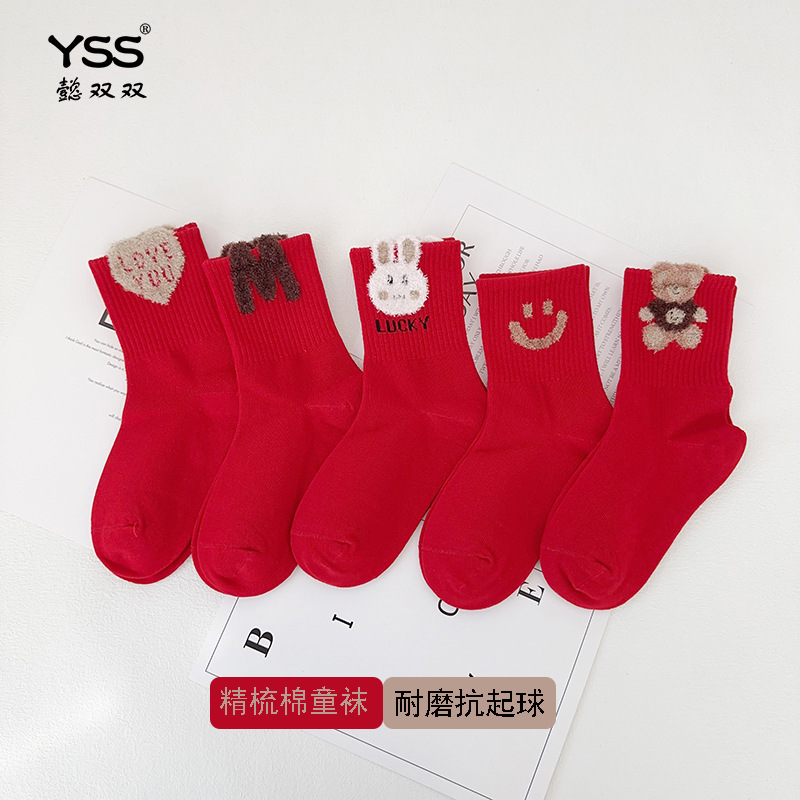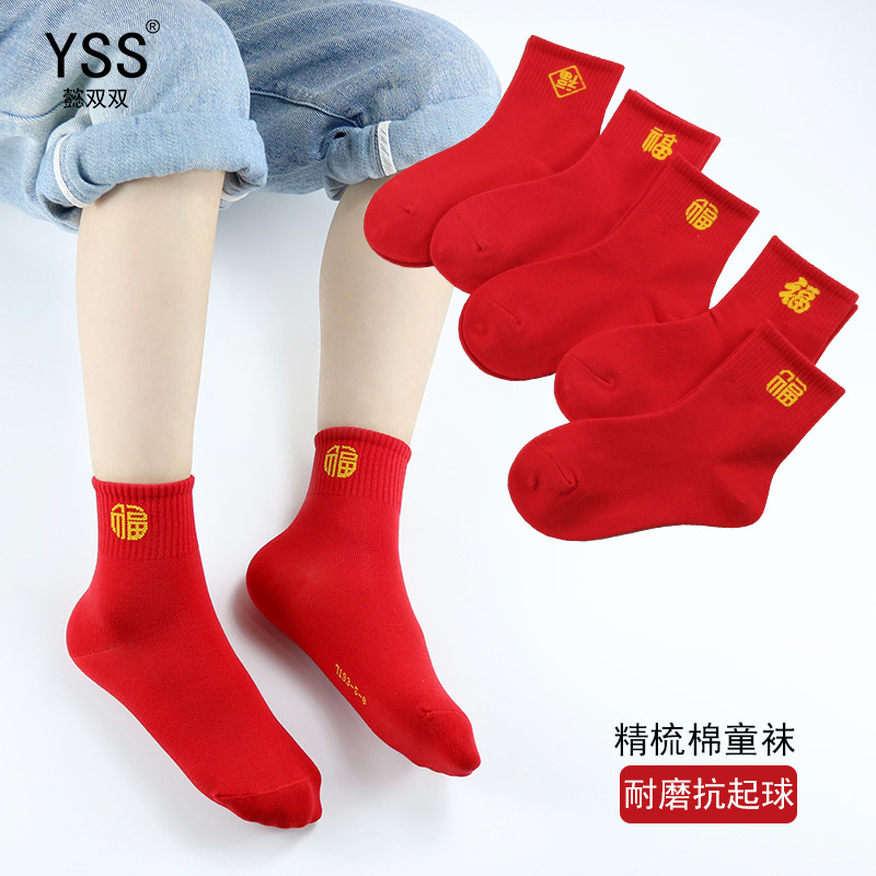 懿の両方の子供の靴下秋冬の新型の福の字の赤い中筒の靴下は綿の本命の年の大きい赤い新年の靴下を梳きます。