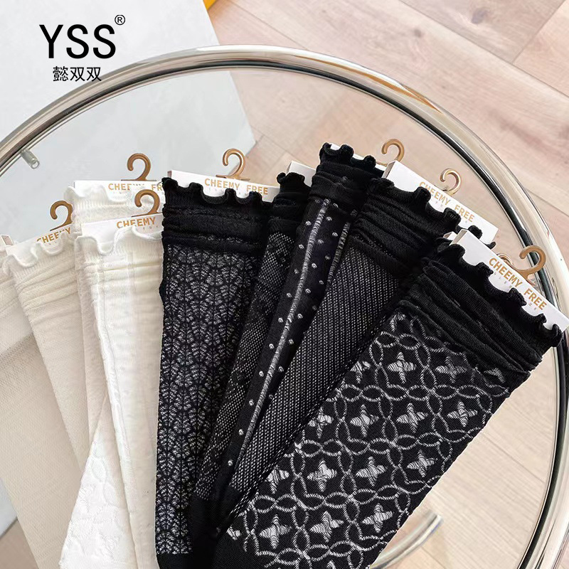 懿両足靴下女性春夏メッシュjk日系木耳レース中筒靴下精練綿白黒韓国版スタッキングソックス