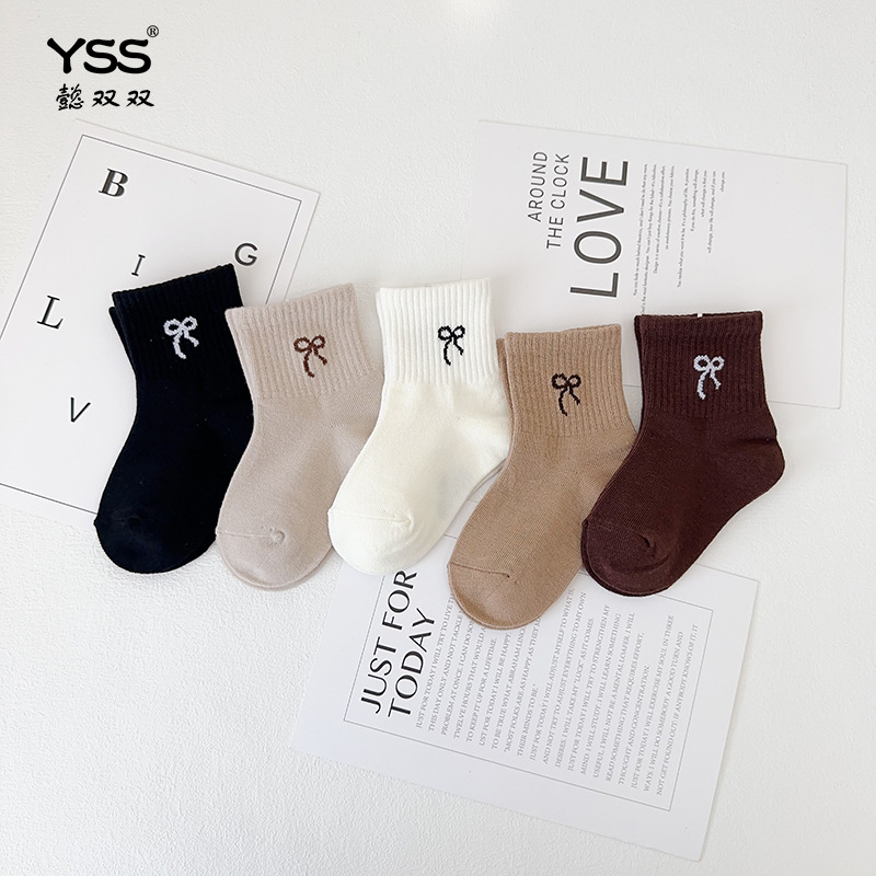 懿の両方の子供の靴下秋冬の新型の韓国版の蝶結びの中筒の靴下の精練綿のカレー色の子供の靴下の骨がない綿の靴下
