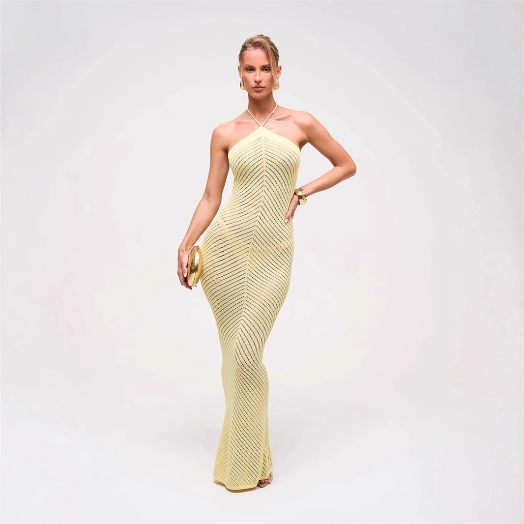 2025夏の新型ニットビーチスカート欧米のセクシーな背中の首の長いスカートの海辺のリゾート風のワンピース