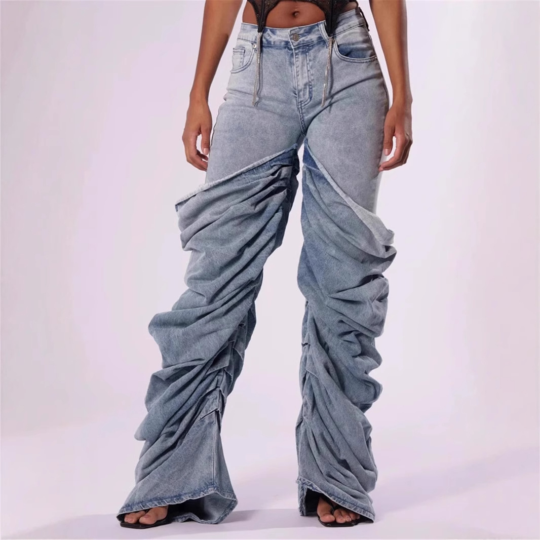 国境を越えた欧米の街頭ファッションinsが独立して立っている不規則なしわが、ズボンの筒のマイクロラッパジーンズの女性をつなぎ合わせている