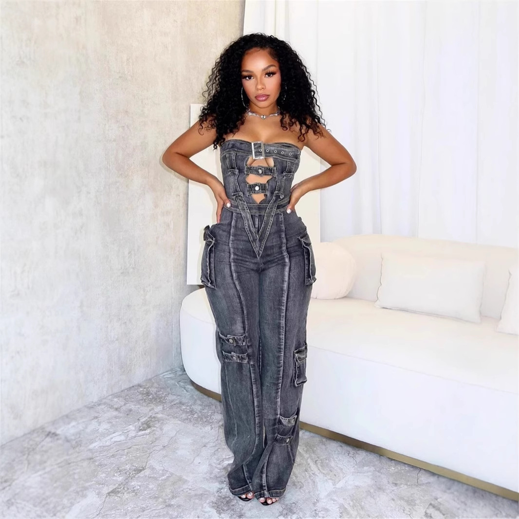 2025欧米の女性のデニムの連体のズボンのアマゾンのクロスボーダーの婦人服のファッションのギャルは胸を拭いて多ポケットの工装のズボンを塗ります。