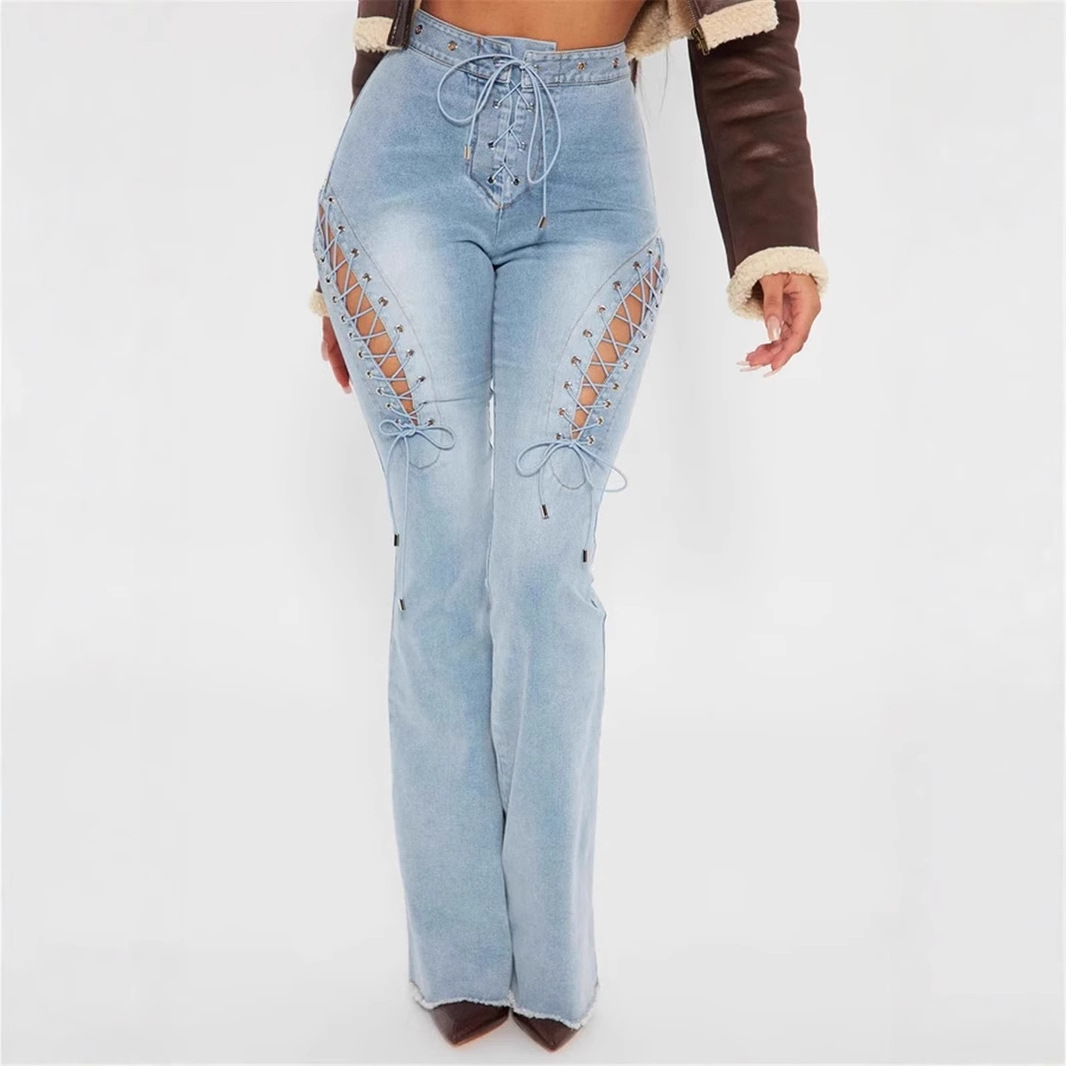 国境を越えた独立駅insが爆発した欧米のセクシーな腰の高い穴の弾力性のある鶏の目のひもの透かし彫りのデニムのトランペットのズボン
