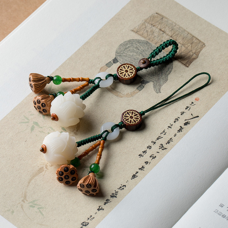 模造菩提蓮の花の車のキーホルダー、桃の木の蓮の実の携帯電話チェーンペンダント、男女カップル用車載ペンダント