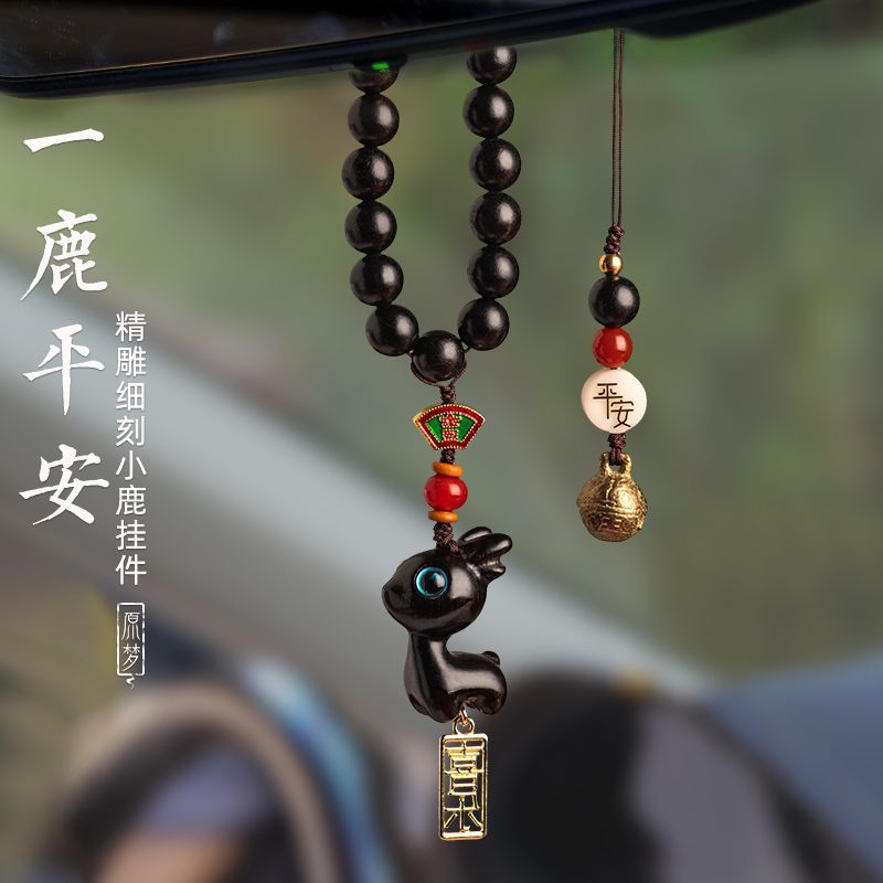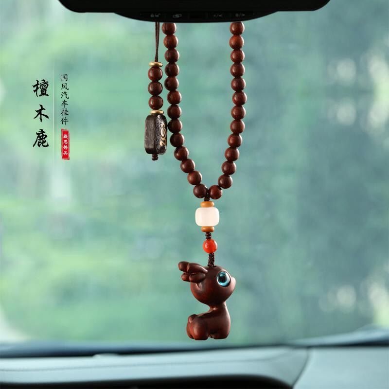 道中平安檀木小鹿自動車バックミラーのペンダントが可愛い車の内装車にペンダントを掛けています。