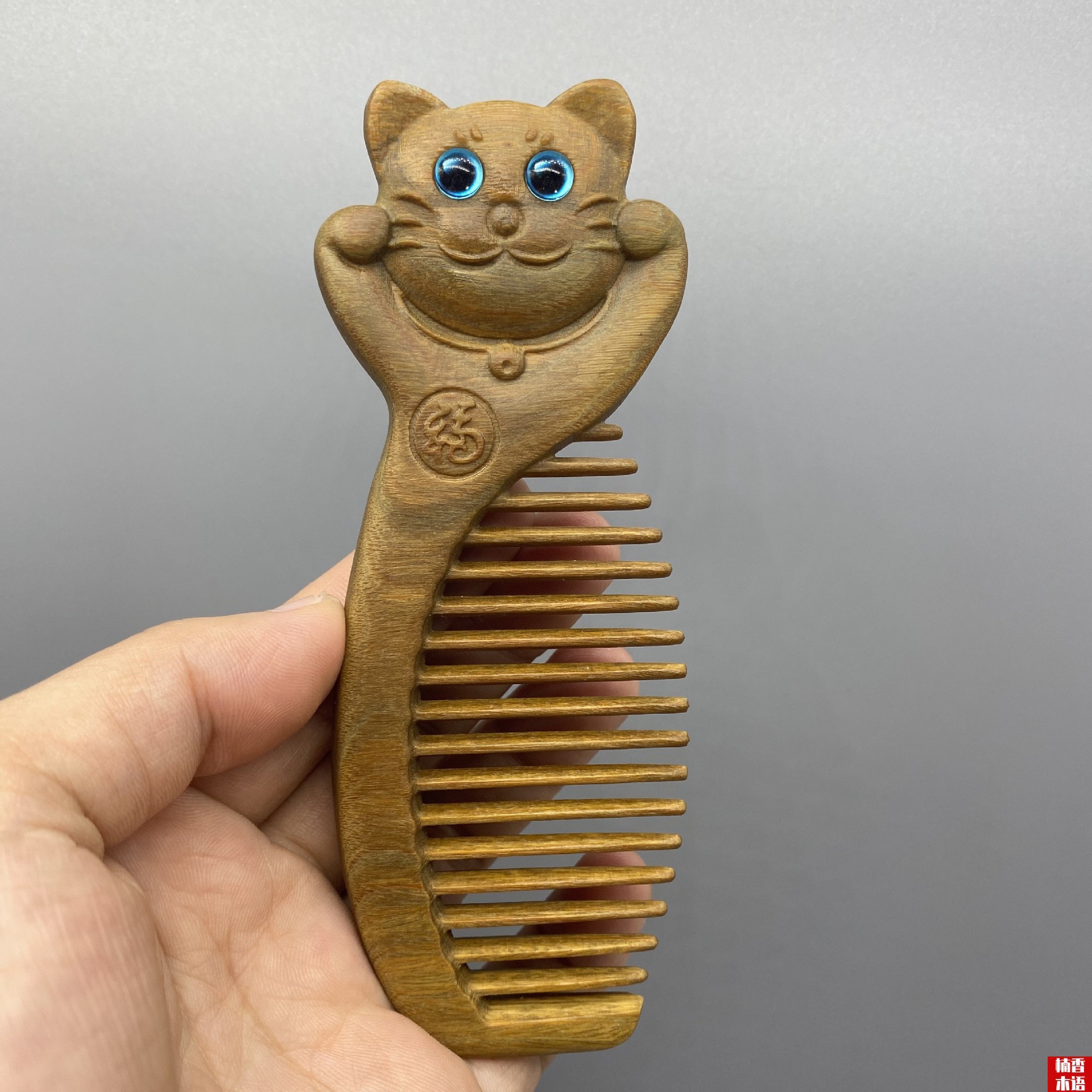 小さな櫛の女性は緑檀萌え子猫櫛実木アニメ動物木櫛原木かわいい猫を持っている