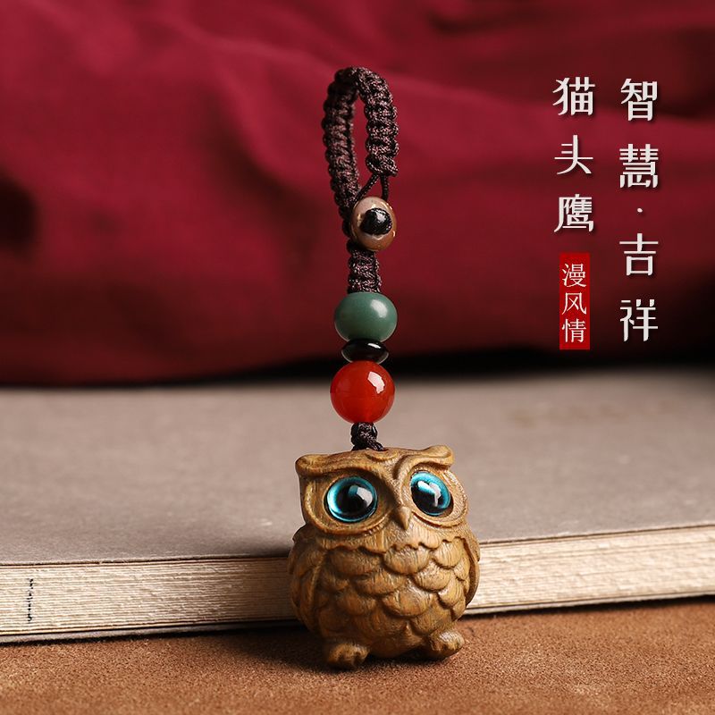 ネット赤緑檀木フクロウ自動車キーホルダー男女カップル鍵飾りチェーン創意リュックサックペンダント