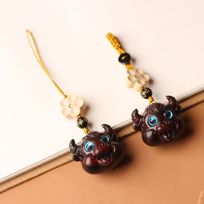 紫檀の木彫りのアニメの子牛の携帯のチェーンは肖牛の自動車のキーホルダーの個性のペンダントを飾ります。