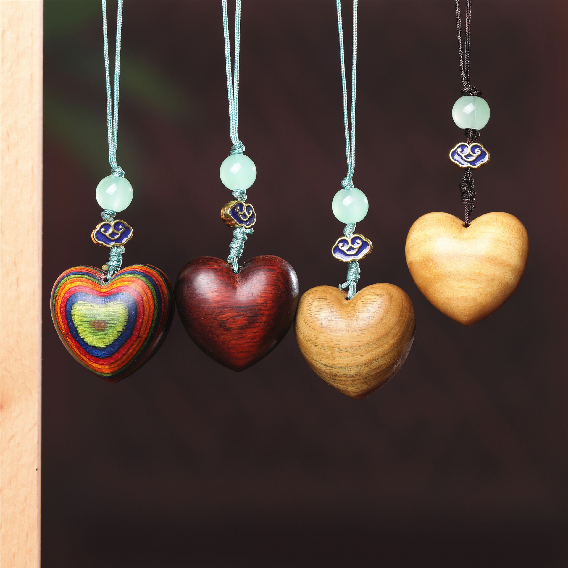 檀木愛ハート形の木製携帯ストラップ車に赤い木文を掛けてペンダントアクセサリーのキーホルダープレゼントをします。