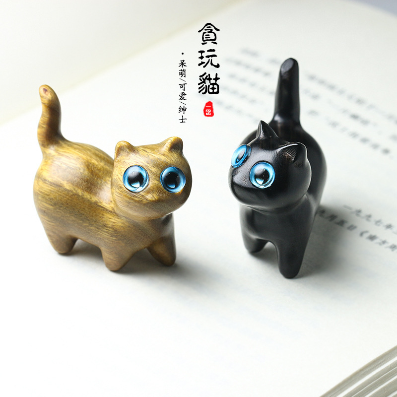 緑檀木黒檀木彫刻は猫のかわいい猫のデスクトップの小さい置物の家庭の創意プレゼントのアクセサリーを遊んでいます。