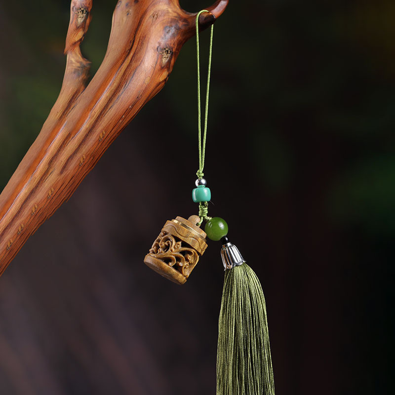 緑檀の木彫りの透かし彫りの桶型の香嚢の携帯電話のペンダントの装飾の鍵の掛け縄のチェーンは国風を開けることができます。