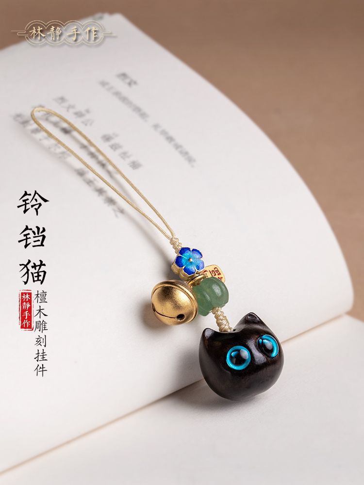 鈴猫檀木猫の携帯チェーンのペンダントが可愛い創意子猫車のキーホルダー