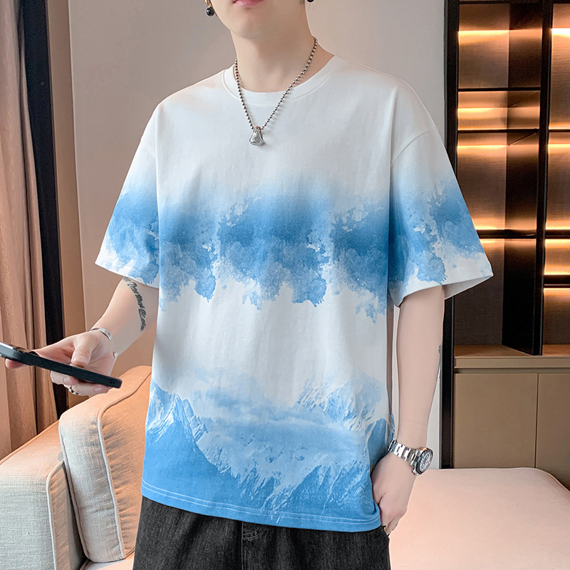 ピュアコットン半袖Tシャツメンズ2025夏新作メンズラウンドネック風景画若者多用途ファッションカジュアルトップ