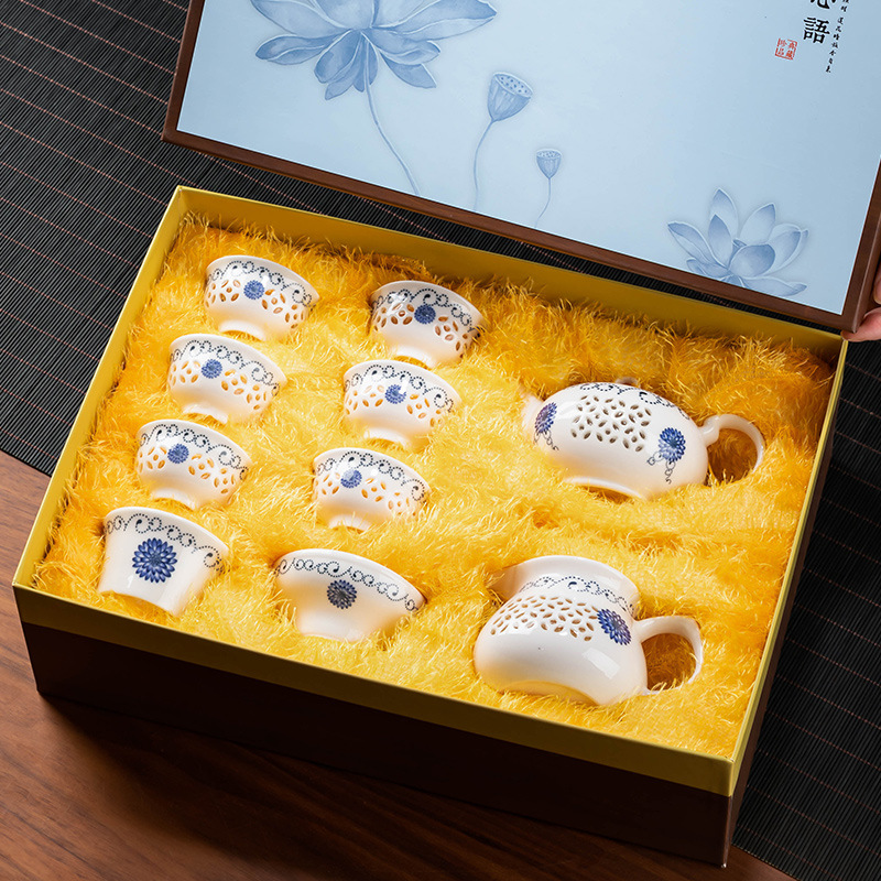 精巧な透かし彫りの蜂の巣の茶器のセットの家庭用の客間の陶磁器の蓋の碗のティーポットはお茶の用品を入れます。