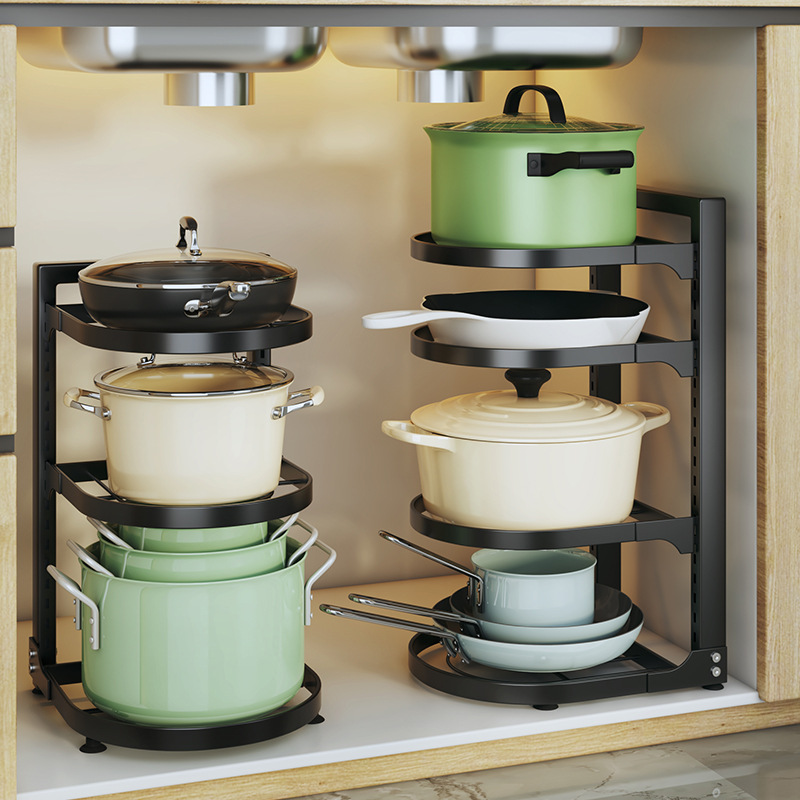 台所調理台鍋棚棚家庭用多層テーブルコーナー鍋具下水槽戸棚内に階層的に収納されている