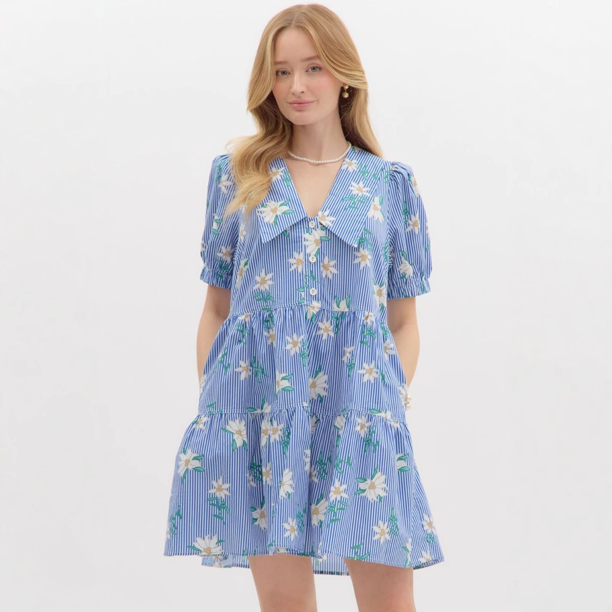 夏のゆったりとしたファッショナブルなプリントストライプドレスシャツVネック半袖ポケット付き花柄トレンディなショートスカート